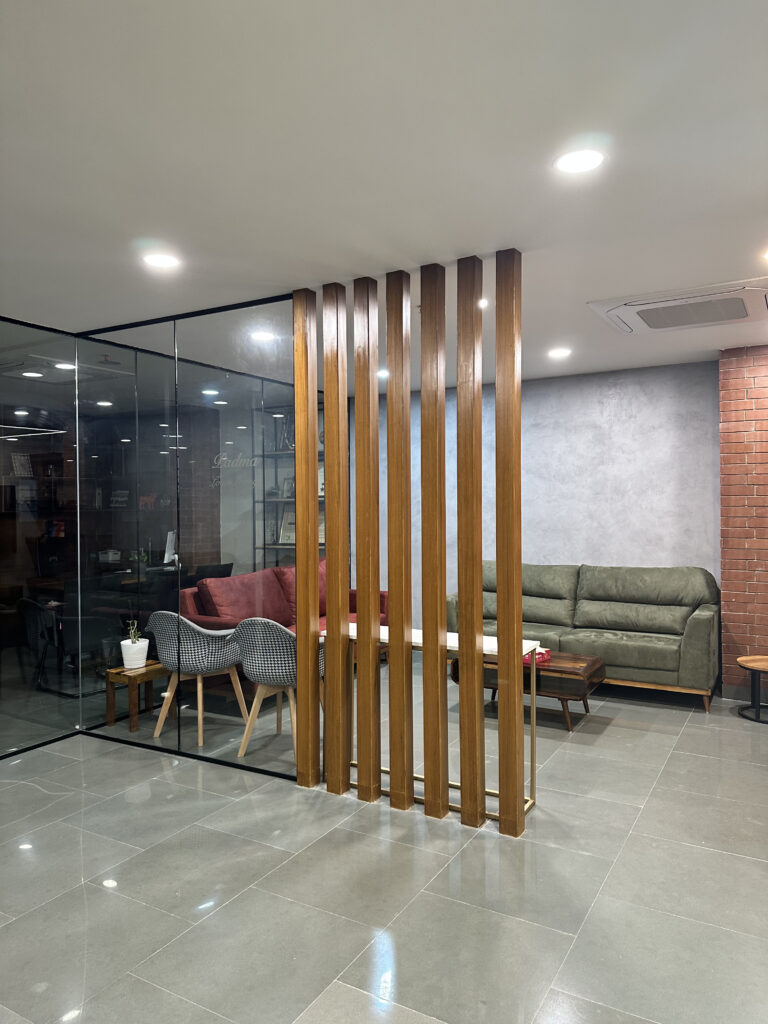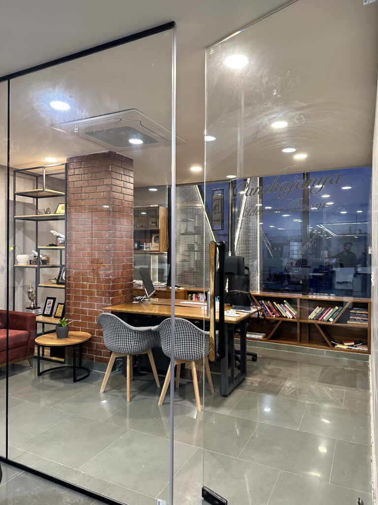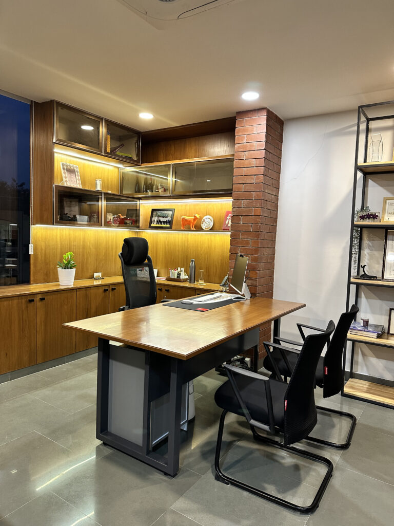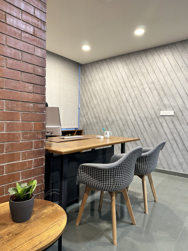 This commercial interior project is designed to reflect a grounded and contemporary workspace, this office interior embraces a minimal yet organic design language. Kota stone flooring lends durability and an understated elegance, while exposed natural brick walls introduce warmth and character. The use of wood veneer adds a layer of sophistication, creating a calm and inspiring environment. The overall design promotes focus and comfort, aligning aesthetics with functionality for a modern professional setting.