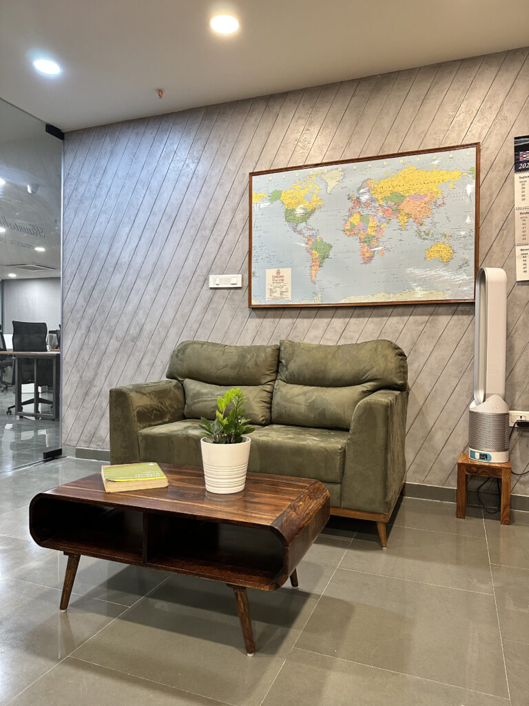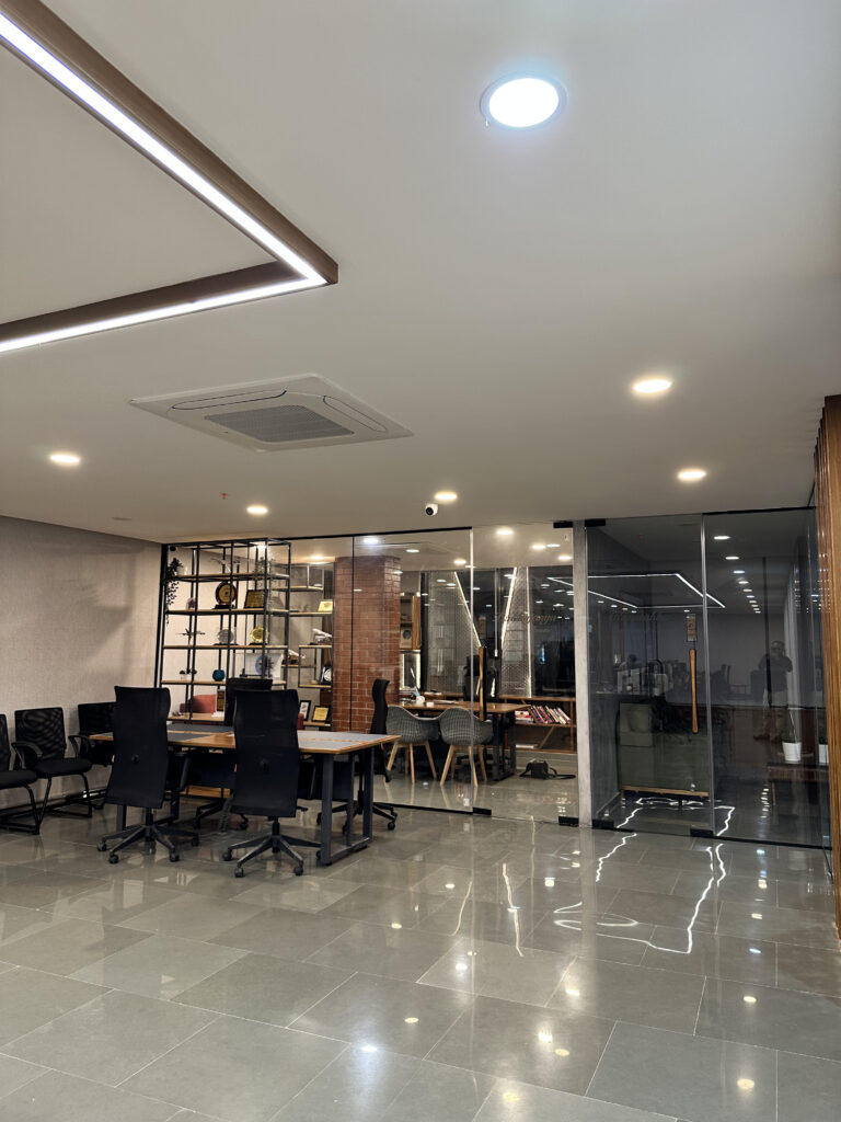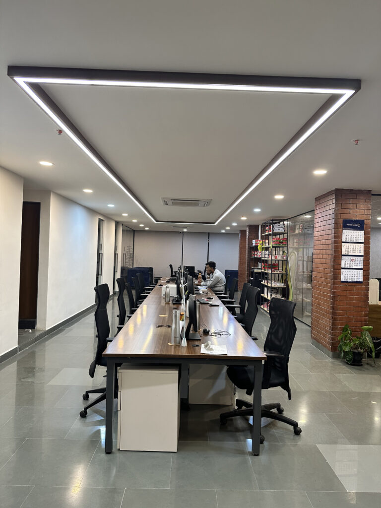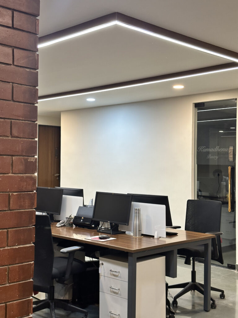 This commercial interior project is designed to reflect a grounded and contemporary workspace, this office interior embraces a minimal yet organic design language. Kota stone flooring lends durability and an understated elegance, while exposed natural brick walls introduce warmth and character. The use of wood veneer adds a layer of sophistication, creating a calm and inspiring environment. The overall design promotes focus and comfort, aligning aesthetics with functionality for a modern professional setting.